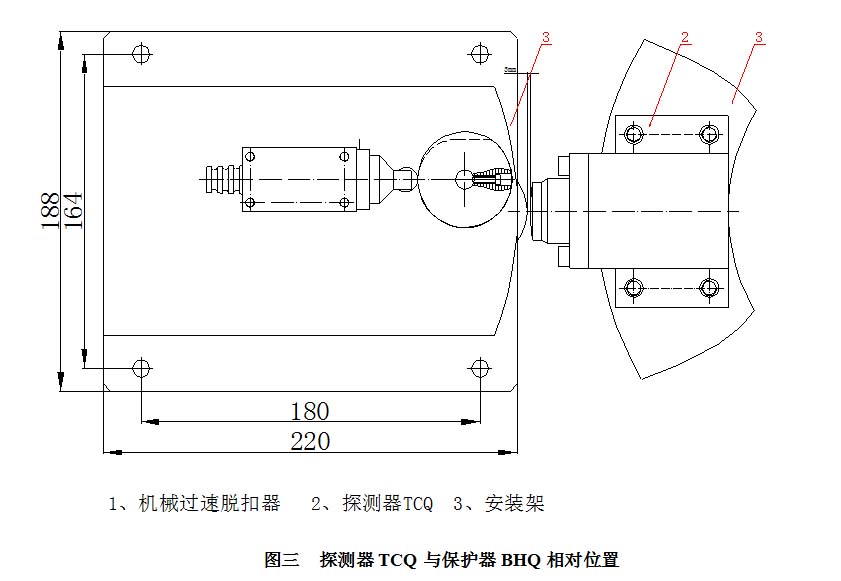 3、安裝過(guò)速保護(hù)器BHQ(由業(yè)主自己根據(jù)現(xiàn)場(chǎng)情況配裝,應(yīng)有足夠的空間供保護(hù)器完成手動(dòng)復(fù)位)及過(guò)速保護(hù)器BHQ的安裝螺栓不能完全緊固,以便于后面調(diào)整,安裝時(shí)要求液壓閥中心高度與過(guò)速探測(cè)器在同一高度,同時(shí)脫扣裝置的一邊與主軸中心線(xiàn)重合(如圖三),然后鎖緊螺栓。