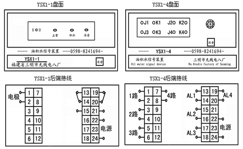 YSX1油積水信號裝置安裝于油箱底部。當(dāng)油箱內(nèi)油混有水并沉積于底部電極裝置時(shí),信號裝置內(nèi)的集成控制電路能發(fā)出報(bào)警信號,運(yùn)行人員可打開電極裝置的Gl/4直嘴旋塞把水放掉。YSX1-1為一路監(jiān)測配套儀表;YSX1-4為4路監(jiān)測配套儀表。