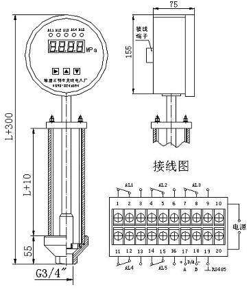 例:表示量程150mm,隔離膜片316L不銹鋼接口,數(shù)碼管LED顯示,2個接點(diǎn)輸出,G3/4鋁合金,帶4~20mA輸出,工作電源AC/DC220V。 |