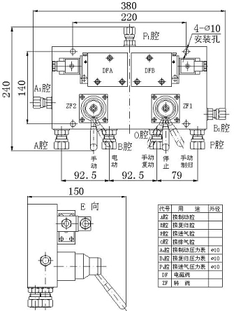 1、自動回路:將手動轉(zhuǎn)閥ZF1的手柄扳到停止位置,手動轉(zhuǎn)閥ZF2的手柄扳到電動位置,壓縮空氣進(jìn)入電磁換向閥DFA、DFB的壓力腔(進(jìn)氣腔),并密封在壓力腔內(nèi),左、右工作腔與排氣腔接通。